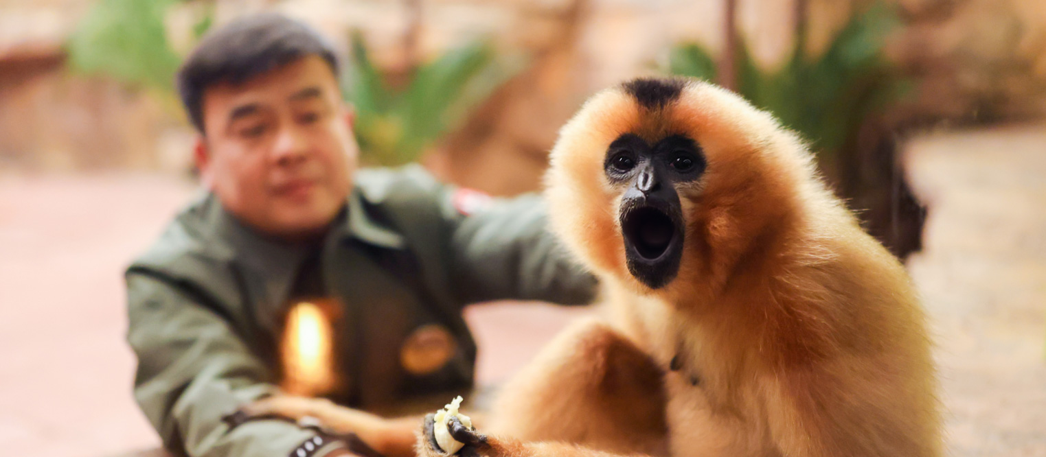 转折始于工作人员一点一滴的耐心,坚持不懈地陪伴和悉心照料。他们像对待一个害羞的孩子,用最柔软的声音和它说话,亲手将美味的葡萄、甜软的红枣和营养的奶片递到它面前。“闪电”逐渐不再像刚开始那样抗拒,它会在工作人员靠近时,不再一味地躲避,而是好奇地打量着他们。有时,它还会试探性地伸出手,接过工作人员递来的水果,动作也不再像之前那样慌乱,开始信任工作人员了。大约一周后,“闪电”彻底放下了戒备。它开始主动迎接工作人员,熟练地接过食物,眼神也变得温顺而明亮。“闪电”开始在它的小天地里活动起来,展现出黄颊长臂猿独有的灵动与敏捷。虽然它的性格依旧内向温顺,但眼中的恐惧已经渐渐消散,取而代之的是对新生活的期待。