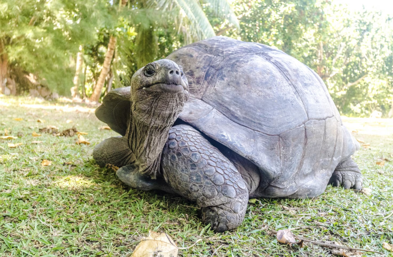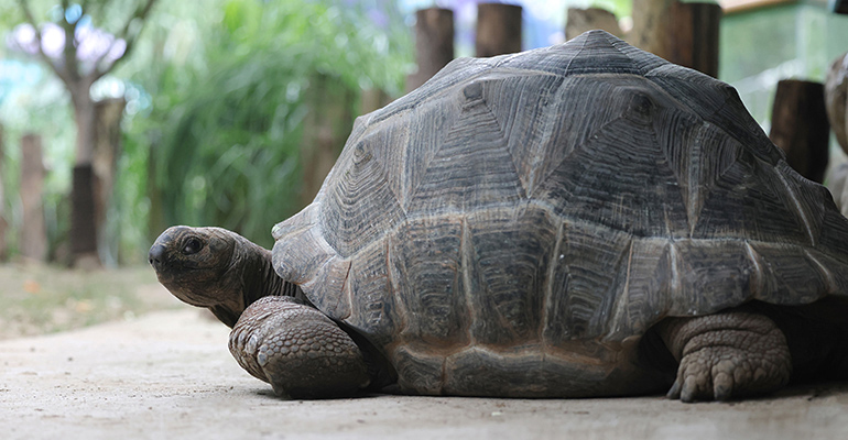 在塞舌尔,有一个龟岛举世闻名,龟岛属于亚达伯拉环礁,位于马埃岛西南,它是塞舌尔群岛中的最大岛屿,也是世界上的第二大珊瑚环礁。岛长30余公里,宽15公里,地势仅高出海面1-2米,四周水流湍急,暗流密布,人所难及。这里栖息着大约15万只大陆龟,由于它们的体形巨大,被人们称为“亚达伯拉象龟”。成年雄龟的甲壳平均长度为120厘米,体重达250千克。它们是行动缓慢的动物,四肢短而粗壮,后腿像大象一样呈圆柱形。厚实,通常是骨鳞片覆盖。脚趾短而两节。短而圆,几乎是扁平的脚,有助于在沙地上行走。