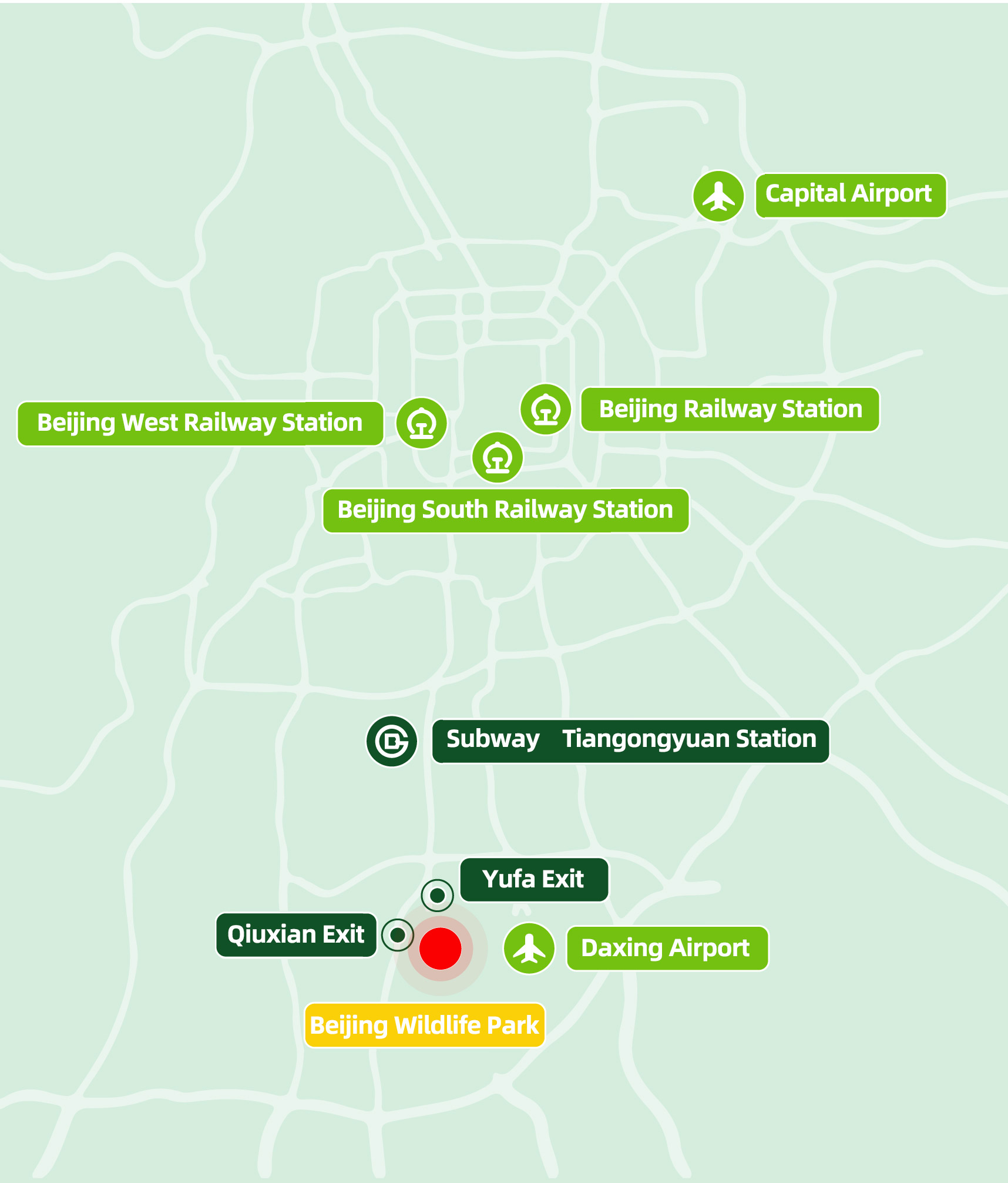 Subway Line 4 to "Tiangongyuan Station": Exit from Gate D, take Bus No. 940 to "Beijing Wildlife Park" stop (about 25 minutes by bus), then walk about 5 minutes to the park gate.